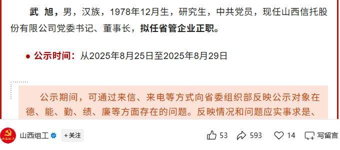 【大河财立方消息】8月25日,中共山西省委组织部公示一批拟任职干部名单,其中,现任山西信托股份有限公司党委书记、董事长武旭,拟任省管企业正职。